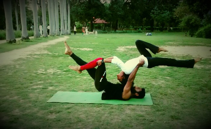 Priyanka: Acroyoga is a form of acrobatic yoga done with a partner. There is a base, person who lies down with their legs in the air. The second person is known as a flier, who balances on the feet of the base (near them hip bones). For beginners, we also need a spotter or two to help support the flier or catch them should the flier slip or start to fall. At the start as a beginner. Poses are held for a few minutes, and as a person advances, move into a flow of transitioning from one pose to another whilst balancing on the base.