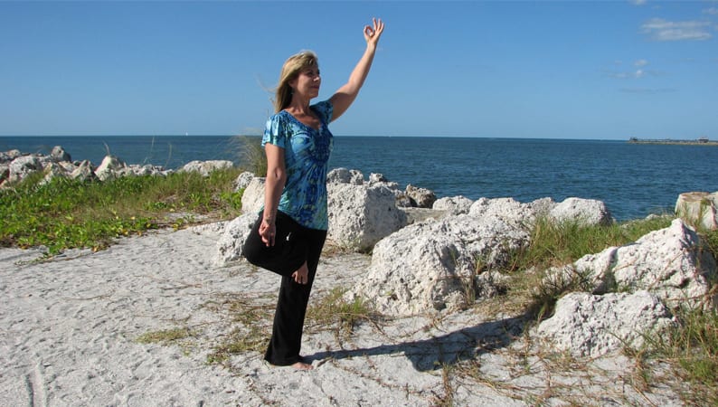 Cindy Bartz: One of my favorite props is a wall – it works well for balance and also to learn proper alignment, such as Warrior I, II and Triangle yoga pose. The wall also works well when learning more complicated poses like headstands. Whether you have been practicing for a few months or many years I still use the wall. Other props I strongly recommend is a yoga strap and a couple of yoga blocks.