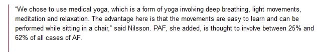 Maria Nilsson, a nurse from Danderyd Hospital, Stockholm, Sweden practicing yoga since last 10 years did investigation in first abstract whether yoga might help patient in AF.